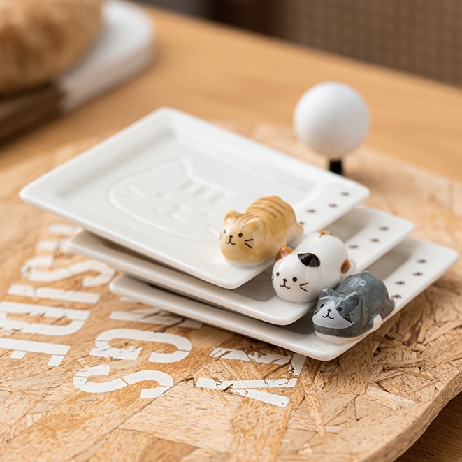 愛らしい猫のフィギュアがちょこんと乗った、癒し系の小皿です。ちょっとしたお菓子やおつまみ、小物置きにもぴったりなサイズ感。お食事の時間がもっと楽しくなること間違いなし!