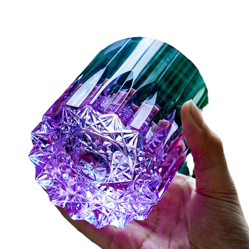 底部には精緻なカット模様が施されており、光を受けるたびに美しい輝きと陰影を生み出します。飲み物を注げば、その色彩がガラスを通して幻想的に変化し、テーブルに華やかなアクセントを添えてくれます。