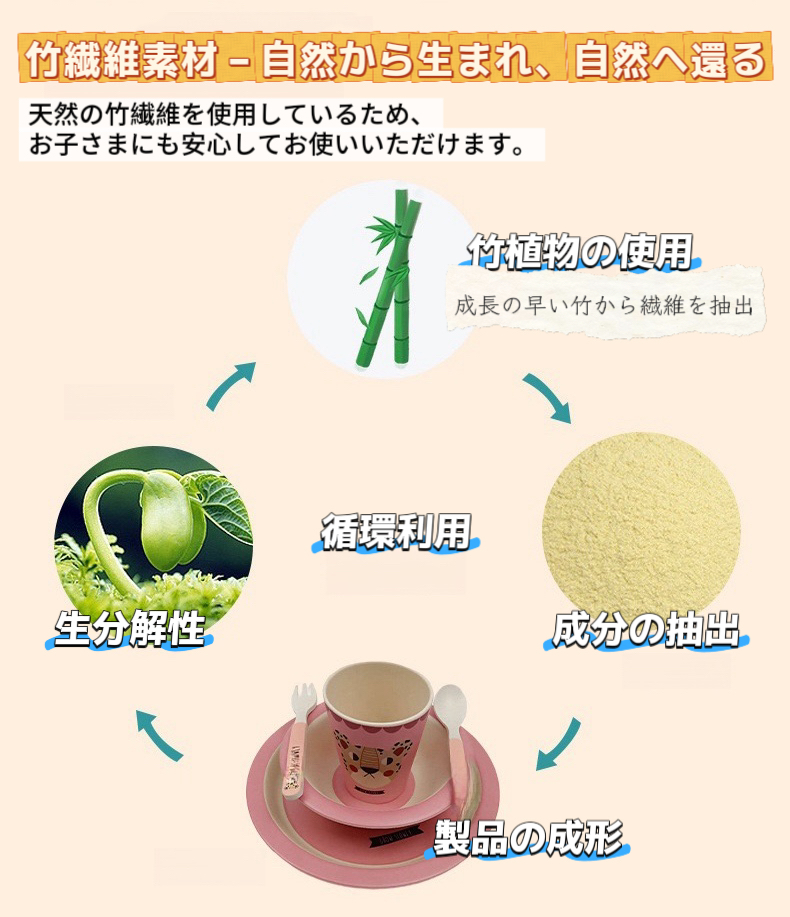 環境にやさしい天然竹繊維を使用した、子ども用の食器セットです。天然素材の特性を活かし、使用後は土に還る「生分解性」を持つサステナブルな製品です。お子さまの毎日の食事をより安全に、楽しく演出します。