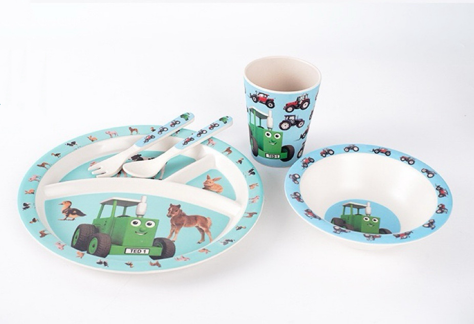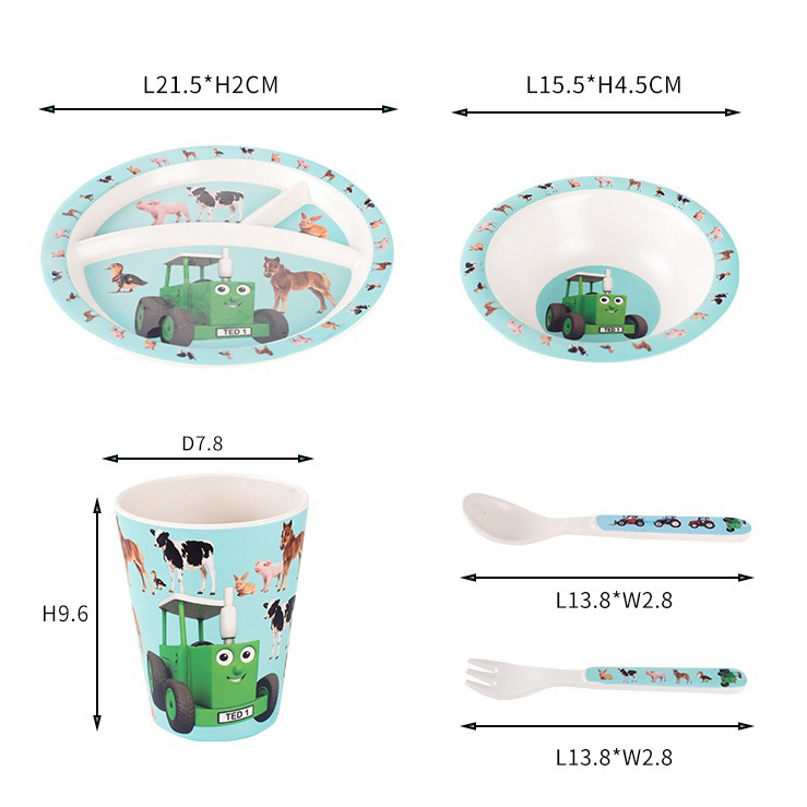 動物やトラクターなど子どもが喜ぶイラスト入り。色彩豊かで楽しい食事時間をサポートします。フォーク・スプーン・プレート・ボウル・カップの5点セット。