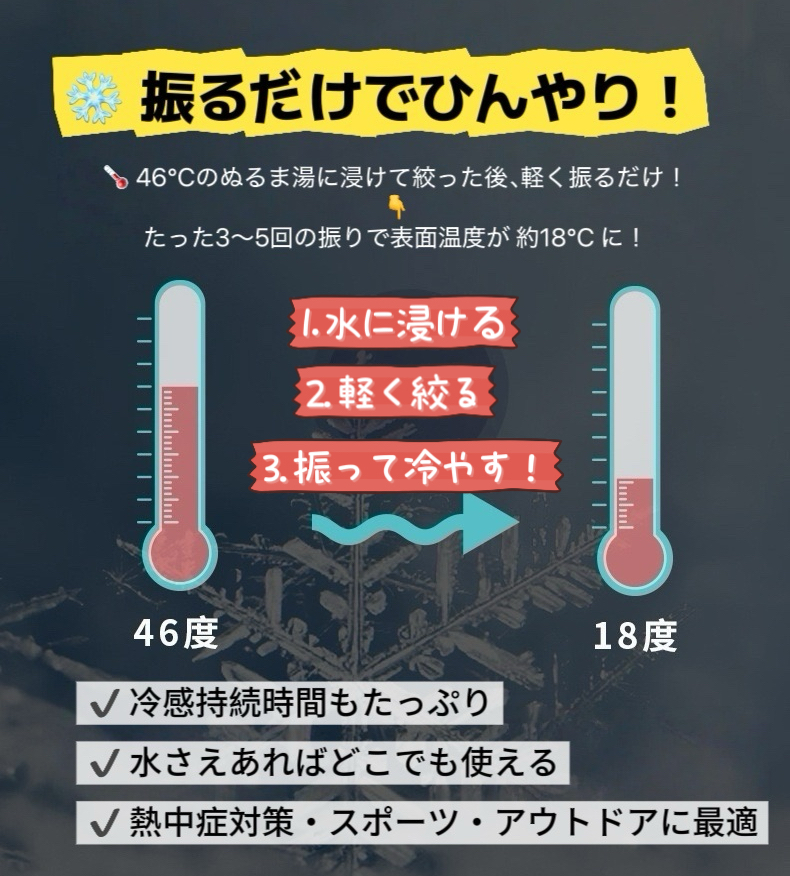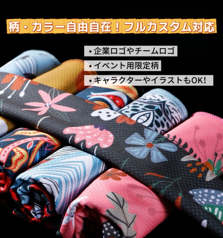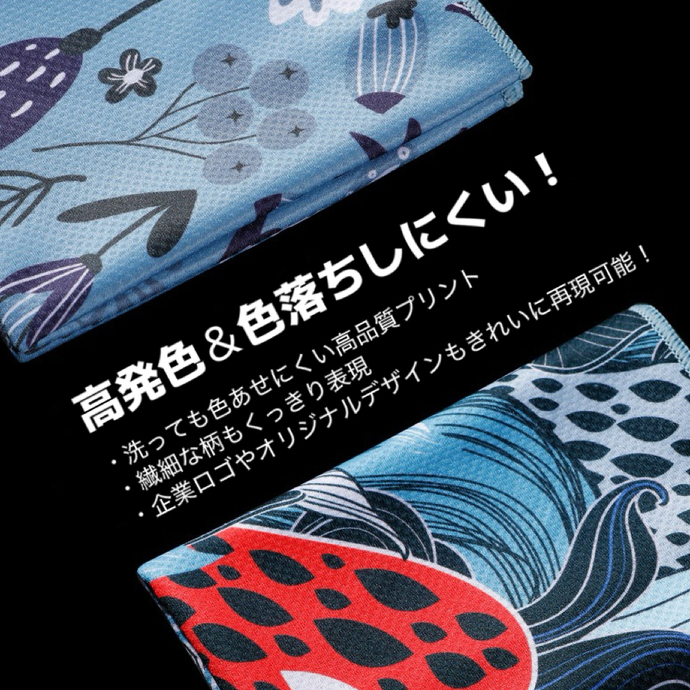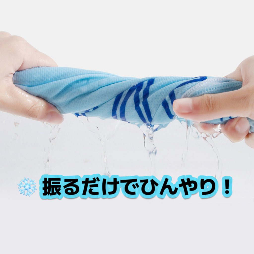 「冷感タオル」は、水に濡らして軽く絞って振るだけで、瞬時にひんやり冷たくなる高機能アイテムです。熱中症対策グッズとして、スポーツ・アウトドア・イベント・作業現場などあらゆるシーンで活躍。